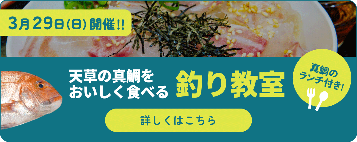 豊かな海と、島々にかこまれて。 上天草は、熊本県の西部に位置し、 有明海と八代海にぐるりと接する 大小さまざまな島々からなります。 その地形から釣り場、魚が多く、 『釣り人の楽園』として、 全国からたくさんの釣り好きが訪れます。そんな上天草の釣り情報をお届けします。 釣りガイド 観光ガイド 上天草マップ 環境活動 【釣り人によるゴミ拾い活動】ビーチクリーンを開催しました@樋島 2026.02.20 環境活動【釣り人によるゴミ拾い活動】年間スケジュールを公開しました 2026.02.19 環境活動釣り人によるアマモ場再生プロジェクト2025〜種蒔き編〜 2025.12.24 環境活動釣り人によるビーチクリーンを行いました@唐船ヶ浜海水浴場 2025.12.17 環境活動 上天草のおすすめ釣りプランをご紹介 家族連れでも楽しめる港をピックアップ 気軽に楽しめて釣れる魚も色とりどり 大海原を舞台に大物と出会えるチャンス 上天草には、沖釣りを楽しめる遊漁船がたくさんあります。上天草は内海なので波が穏やかで船の揺れが少ないのが特徴です。 釣りに上天草観光をプラスしてもっと充実 温泉に入って疲れた体をリフレッシュ 天草の名産品を味わえるお店などをご紹介 上天草のさまざまな特産品を取り揃えています 熊本市内から車で約1時間!上天草は島々からなっていますが、橋で繋がっているので車で気軽に行くことができます。 マップ上の数字をクリックすると、詳細を見ることができます。 マップ1岩谷港 周囲を山に囲まれているため強風下にも強い港。三角ノ瀬戸から複雑な潮が入り込むため、魚たちにとっては絶好のエサ場となっている。良型のアジやセイゴが回遊するほか、ウキ釣りでのクロダイやメジナ、ルアーやブラクリ釣りで狙えるガラカブ(カサゴ)、エギングのアオリイカなど豊富。 おすすめ4港はこちら マップ2さばきや おとちゃん 【営業】11:00-14:00(14時以降になる場合は早めに連絡)/不定休 【料金】魚の重量に応じて決定 魚さばきサービスはこちら マップ3大空食堂 地元民も観光客も訪れる根強い人気の老舗ちゃんぽん屋さん。キャベツやもやしなどの野菜がてんこ盛りでボリュームたっぷり。 上天草のグルメはこちら マップ4ちゃんぽん入船 名物は「天草海鮮ちゃんぽん」。有頭エビやアサリ、イカ、タコ、イワシのつみれなど、たっぷりの海の幸が入ってインパクト抜群です。 上天草のグルメはこちら マップ5白涛海水浴場 マップ6登立漁港 おすすめ4港はこちら マップ7藍のあまくさ村 日本最大の天草四郎像が目印。所せましとお土産品が陳列された売り場のほか、焼きたてのちくわを見学できるエリアもある。 上天草のお土産はこちら マップ8ミスターバーガー 地元民に愛され続けて40年以上の老舗 ハンバーガーショップ。丁寧に焼かれるハンバーガーの美味しさもさることながら、格安のお値段にもびっくり! 上天草のお土産はこちら マップ9串漁港 おすすめ4港はこちら マップ10成合津 マップ11弓ヶ浜・弓ヶ浜港 マップ12湯楽亭 源泉をそのまま掛け流して使用しており、温泉成分が身体に染み入っていくような感覚を楽しめる。大洞窟風呂で知られ、泉質成分によって赤湯と白湯に分かれ、2種類の湯 を楽しめる。 上天草の温泉はこちら マップ13七つ割漁港 おすすめ4港はこちら マップ14唐船ヶ浜海水浴場 マップ15野釜漁港 おすすめ4港はこちら マップ16鳩之釜漁港 北からの季節風に強い、南に向く広大な漁港、釣り場は南東に延びる長い波止がメイン。港内側は足場が広くファミリー向けだが、養殖用イケスのロープに注意が必要。沖側や先端部分は一段高くなっている。夏~秋のアジは朝夕時に釣果が手堅く人気、近投でのキスも。ほかウキ釣りでのクロダイ、冬はメバルが楽しめる。 おすすめ4港はこちら マップ17麻こころ茶屋 鳩之釜漁港そば、気づかずに通り過ぎていく人も少なくないが、開店前から人が並ぶ人気ドーナツ店。想像を超える絶品のドーナツ&コーヒーで至福の時をぜひ! 上天草のグルメはこちら マップ18江樋戸港・正木鮮魚 魚さばきサービス【営業】7:00-17:00(事前に要連絡)/日曜定休【料金】魚の重量に応じて決定 魚さばきサービスはこちら おすすめ4港はこちら マップ19スパ・タラソ天草 スパ(天然温泉)は美人の湯として名高い上天草の良質の泉質の温泉を楽しめ、国内でも数少ない本格的なタラソテラピー施設は海水によるリラックス効果で人の健康づくりをサポートする。 上天草の温泉はこちら マップ20マルケイ鮮魚 魚さばきサービス【営業】7:00-17:00/年中無休【料金】魚の重量に応じて決定 魚さばきサービスはこちら マップ21宮津海遊公園 マップ22道の駅 上天草さんぱーる 地元の漁師が早朝に水揚げした新鮮な魚介類や、特産の車エビなどの販売や全国発送を行っている。ほか野菜・果樹コーナーや特産品・お土産コーナー、レストランも。 上天草のお土産はこちら マップ23天草四郎ミュージアム マップ24おやつ家 菓音 バスクチーズケーキやクロワッサンも注目だが、人気